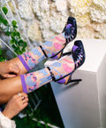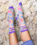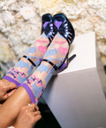 Get ready with Glinda in this shimmer sheer sock that includes various elements of Glinda’s wardrobe: her tiara, wand, signature G, and the tap to bubble icon. Finished with a purple heel, cuff and toe and set against white shimmer fabric for a frosty vibe that’s perfect for the cooler months.
