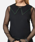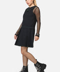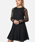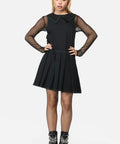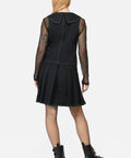 Black pleated pinafore with a slick, cyber-inspired edge. Designed with vibrant green topstitching, a dramatic pointed collar, and glitchy Matrix vibes — it’s goth, it’s Y2K, it’s hacker chic.