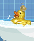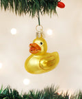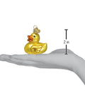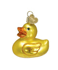 The Rubber Ducky has been a favorite bath time toy for decades. Just its image reminds of us of childhood innocence and playtime. This glass ornament was delicately hand-painted with brightly colored lacquers and glitter for you to enjoy!