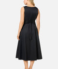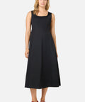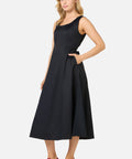 Effortlessly elegant and endlessly versatile, this black midi dress is made from soft organic cotton with a subtle sheen. Its fit-and-flare silhouette and side ties create a flattering, cinched shape that transitions seamlessly from daytime ease to evening polish.
