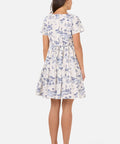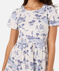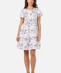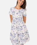 Cream & blue short sleeve, mid length cotton tiered smock dress. Printed in a gorgeous seaside toile style, featuring penguins, seagulls, sailboats and a lighthouse. Too cute!!