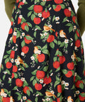 A charming midi skirt featuring a sweet print of little robins nestled among apples and delicate blossoms. With its floaty A-line silhouette and soft movement, this piece brings a touch of storybook romance to everyday dressing.