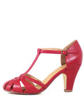 A beautiful T-strap vintage inspired heel with crisscrossing bands showcases a vintage look on a classic design with leather lining.