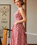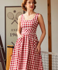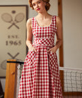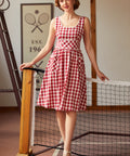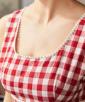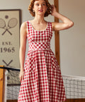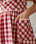 Crafted in a classic red-and-cream gingham, this fit-and-flare silhouette features playful pom-pom trim for an extra dash of whimsy, plus handy patch pockets (because joy should be functional). Finished with a stretchy smocked back for comfort, this cotton dress is fully lined and ready for brunch dates, bake sales, and being the cutest person in the room—effortlessly.