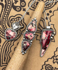 The gemstone is set in handcrafted sterling silver with a serrated bezel and accented with twisted decorative wire and sterling silver ball details. The lightning bolt shape adds a strong rock-and-roll edge while highlighting the unique character of the stone.