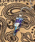 This bold one-of-a-kind pendant features a striking lightning bolt-shaped gemstone with rich purple tones and a dramatic bronze matrix. Made from stabilized dolomite and inspired by White Buffalo-style stones, the unique material creates a vibrant and eye-catching design.