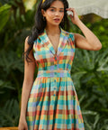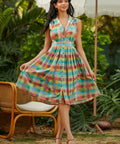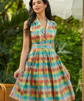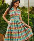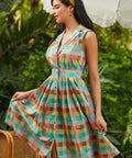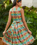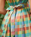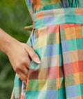 The wide waistband defines the waist before flowing into a full, twirl-ready skirt, while the tie at the back lets you customize your fit (and your bow moment). And yes—there are pockets, perfectly placed for easy charm. Finished in a colorful patchwork plaid that feels equal parts nostalgic and playful, it’s made for picnics, day trips, and any excuse to spin just once more.
