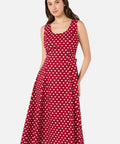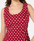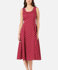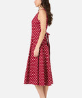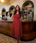 Step into timeless preppy charm with the Sweet Heart Midi Dress. Featuring a playful polka-dot heart print on vibrant red cotton, this sleeveless midi balances classic elegance with whimsical detailing.