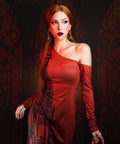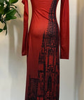 The ombre color of this dress goes from a rusty red to a dark blood red.