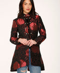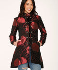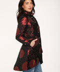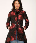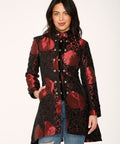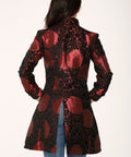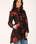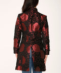 Make a dramatic entrance in this stunning red and black brocade coat — a showstopper that channels vintage romance with a modern edge. The tailored silhouette features a high-low hem, ornate button front, and subtle stretch for a flattering, comfortable fit. Perfect layered over dresses or jeans for a statement look that turns every outing into an occasion.