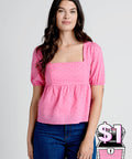 Made from a bright pink-hued cotton dobby weave, this ModCloth namesake label top has the perfect amount of prairie inspiration along with a timeless silhouette to be a favorable addition to your spring wardrobe rotation. Featuring intricately embroidered and ultra-charming Swiss dot daisies all over, this bold babydoll blouse boasts a flattering square neckline, tie-back closure, gathering at the empire waist, and short puff sleeves. A great piece to wear with your favorite high-rise jeans and boho-chic shoes of your choice for an ultimate cottagecore look.