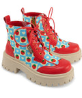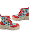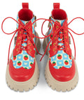 - Vibrant red faux-leather accents and lace-up front with gold eyelets add bold contrast and charm