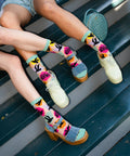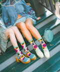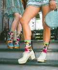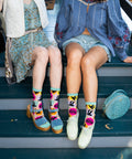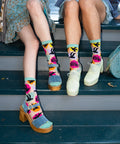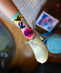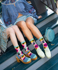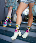 A little bit vintage, a little bit eerie, and completely iconic. Our officially licensed The Birds Sheer Crew Sock is a wearable tribute to Alfred Hitchcock’s legendary thriller—reimagined in bold Sock Candy style. Set against a sheer backdrop, striking black bird silhouettes swoop across colorful pastel blocks of mint, lavender, yellow, and orange. A hot pink block features The Birds logo front and center, delivering a pop-art punch that feels equal parts retro and rebellious. The soft mint cuff adds the perfect finishing touch, giving this statement sock a playful, polished edge.