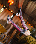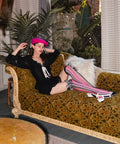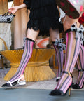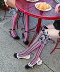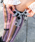 Channel effortless French-girl charm in our Parisian Stripe Bow Black Sheer Knee High Sock. A vertical stripe design in pink and black elongate the leg for a playfully polished vibe. Adorned with an oversized chiffon bow with black floral details that add the signature Sock Candy touch. The black sheer base gives just enough coverage and sophistication, while the ruffle cuff gives the sock a hint of sweetness. These knee-highs are the perfect companion to Mary Janes, slingbacks, or strappy heels.