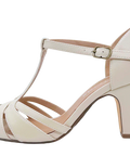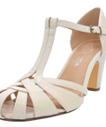 A beautiful T-strap vintage inspired heel with crisscrossing bands showcases a vintage look on a classic design with leather lining.