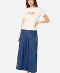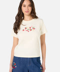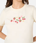 A playful cream tee featuring a hand-painted print of fresh cherries, strawberries, and daisies. Light, casual, and effortlessly charming, this semi-fitted tee is perfect for sunny days, layering, or pairing with your favourite skirts and pants.