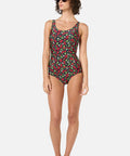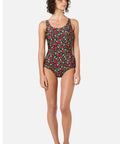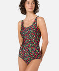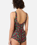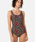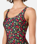 Navy one piece swimsuit, with a low side seam for fuller coverage, printed with sweet raspberries & pretty blossoms, the perfect summer bathers