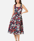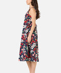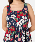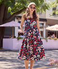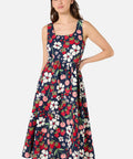 A charming navy midi dress featuring a hand-painted print of fresh cherries, strawberries, and daisies. Sweet yet timeless, this summer-ready style blends playful detail with an effortlessly flattering silhouette—perfect for sunny days and picnic outings.