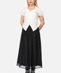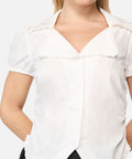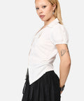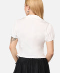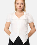 A gothic take on regal romance, the Prudence Lace Trim Blouse is for those who dream of being the princess of their local goth scene. This tailored blouse features a striking V-shaped neckline with a shaped collar, finished with delicate lace trim for a touch of vintage drama. Its puff sleeves add soft structure, while the button-front closure and tailored fit keep it chic and versatile. Pair it with skirts, trousers, or corsetry for a look that blends royal elegance with gothic edge.
