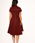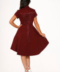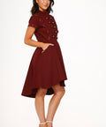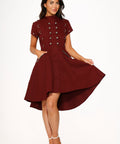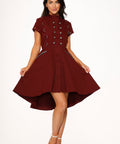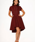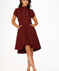 Command the room in this structured swing dress, crafted in a rich burgundy hue with vintage-military detailing. The cotton-blend fabric offers comfortable stretch, while the decorative buttons and D-ring accents bring bold personality. Finished with a front center zipper, handy side pockets, and a flared high-low hem for a feminine twist.