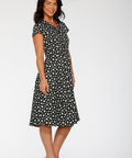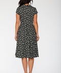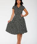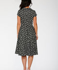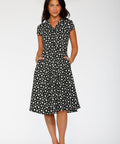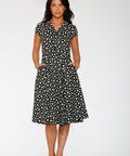 Sweet with a hint of sass, this black swing dress features an allover white cat paw print for a playful twist on a vintage silhouette. Made from a soft cotton-blend fabric with gentle stretch, it’s designed for all-day comfort. A fitted bodice, flared skirt, and side pockets make it as functional as it is charming.