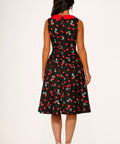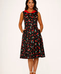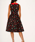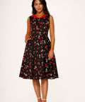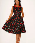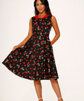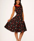 Sweet and timeless, this vintage-inspired swing dress features a playful cherry print on a classic black backdrop. The fitted bodice and flared skirt create a flattering silhouette, while the red contrast collar adds a pop of retro charm. Crafted from a soft cotton-blend fabric with gentle stretch and finished with convenient side pockets for everyday ease.