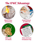 Celebrate the special talents of the artist with this beautiful glass ornament. It was carefully mouth-blown into a finely crafted mold. Then a hot solution of liquid silver was poured inside. Finally, the ornament was delicately hand-painted with many brightly colored lacquers and glitters for you to enjoy!