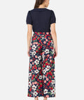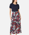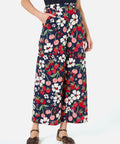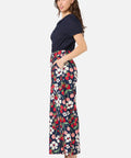 A playful navy pant featuring a hand-painted print of fresh cherries, strawberries, and daisies. With a high-waisted fit and wide-leg silhouette, these summer-ready pants combine comfort and charm—perfect for sunny days and picnic adventures.
