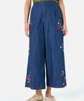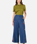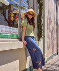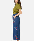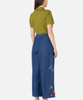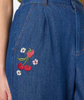 A playful take on classic denim, these cropped wide-leg culottes feature sweet embroidery of fresh cherries, strawberries, and daisies. Light, charming, and easy to wear, they bring a cheerful touch to everyday outfits.