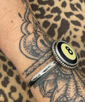 Handmade in California, this retro-inspired one-of-a-kind cuff features a round shaped piece of an authentic 8-ball, set in a sterling silver scalloped bezel with intricate twisted and beaded deco wire detailing. This unique piece blends vintage billiards charm with bold symbolism.