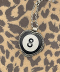 Handmade in California by Bog-Art-Studio, this retro-inspired one-of-a-kind pendant features a heart-shaped piece of an authentic 8-ball, set in a sterling silver scalloped bezel with intricate twisted and beaded deco wire detailing. Suspended from an 18" sterling silver chain, this unique piece blends vintage billiards charm with bold symbolism.