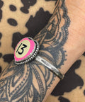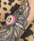 Handmade in California, this retro-inspired one-of-a-kind cuff bracelet features an authentic piece of a classic billiard ball, set in a sterling silver serrated bezel with intricate beaded deco wire detailing. Designed with an adjustable cuff for a comfortable fit, this bold piece blends vintage billiards charm with timeless style.