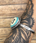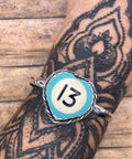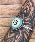 Handmade in California, this retro-inspired one-of-a-kind cuff bracelet features an authentic piece of a classic billiard ball, set in a sterling silver serrated bezel with intricate beaded deco wire detailing. Designed with an adjustable cuff for a comfortable fit, this bold piece blends vintage billiards charm with timeless style.