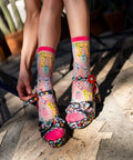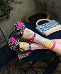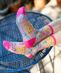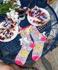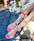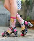 Sweet, sparkly, and straight out of a countryside daydream. Our Bows & Jam Shimmer Sheer Sock is a love letter to picnic blankets, homemade preserves, and perfectly tied ribbons. This whimsical sheer style features delicate floral bows and tiny jam jars scattered across a soft shimmering base. Pastel colors of mint, lavender, buttery yellow, and strawberry pink pop against the light-catching backdrop, while a bright pink cuff, heel, and toe add a girly finishing touch. Whether you’re headed to brunch, the farmer’s market, or simply dressing up an everyday look, this style adds a charming twist that feels both nostalgic and fresh.