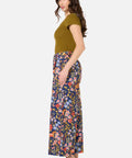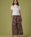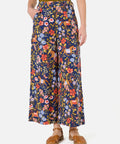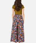 Navy blue wide-leg culotte style pant, printed in a beautiful folksy design featuring prancing horses in an enchanted flower meadow.