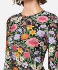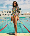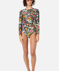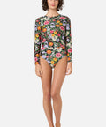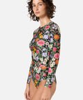 Black long sleeve rashie swim top printed with a gorgeous field of vintage blooms, the perfect sun smart bathers