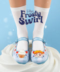 Printed fabric upper featuring a whimsical winter theme with snowflakes, candy-stripe accents, and playful character art