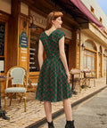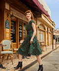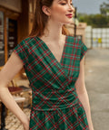 The Greta is everything you could want and more!  Shown in our Holiday Plaid print, this vintage style cotton dress features a gathered surplice neckline, cummerbund waist with figure flattering gathers, a vintage inspired twirl-worthy skirt with hidden side pockets, and a back zippered closure.