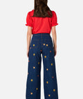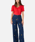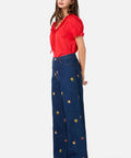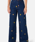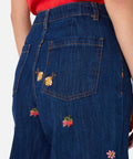 A charming take on classic denim, these high-waisted jeans feature delicate embroidery inspired by nature, adding a whimsical touch to an everyday staple.
