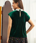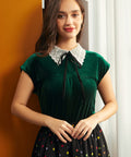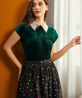 Channel vintage romance with the Velvet Reverie Top from our ModCloth namesake label. This soft, shimmering emerald blouse features delicate gathering, cap sleeves, and a scalloped lace collar tied with a velvet ribbon bow—equal parts sweet and sophisticated. Whether paired with a plaid skirt or high-waisted trousers, it’s a timeless piece that brings festive flair and old-Hollywood charm to any occasion.