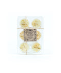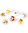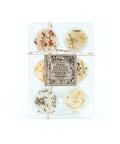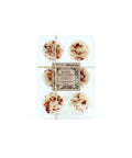 The set comes inside a clear cavity tray with lid, and each individual tea light is housed in a clear container. Each pack comes with 6 tealight candles, and are topped with quartz crystals and herbs.