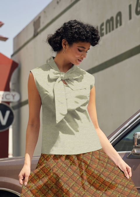 This top is for the vintage lover at heart! Now available in our Sage Dot print. This 100% cotton top features bust darts for a flattering silhouette, a side zippered closure for ease of wear, and an oversized bow at the neckline for that perfect 1950's inspired look.