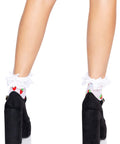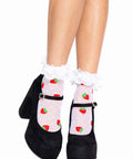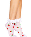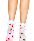 Add a little sweetness to any look with these strawberry ankle socks by Leg Avenue. The woven strawberry design and polka dot detail of these anklets pair perfectly with the lace ruffle cuff for a look that's kawaii perfection.