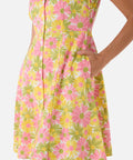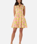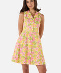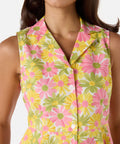 A playful nod to the 60’s, this sleeveless shirt dress features an all-over daisy print in a retro-inspired palette of pinks and greens. With a fitted bodice, flared skirt, and classic shirt dress styling, it’s a flirty, vintage-ready piece for sunny days.