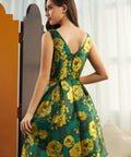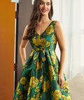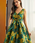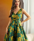 Step into timeless elegance with the Gilded Garden Fit & Flare Dress from our ModCloth namesake label. Crafted in our luminous Gilded Petal jacquard, this sleeveless beauty shimmers with golden blooms against a rich emerald backdrop. The flattering V-neckline, pleated skirt, and self-tie waist create a romantic silhouette that moves with grace. Hidden pockets add a touch of practicality to its party-ready charm—perfect for soirées, celebrations, and every moment that deserves to sparkle.